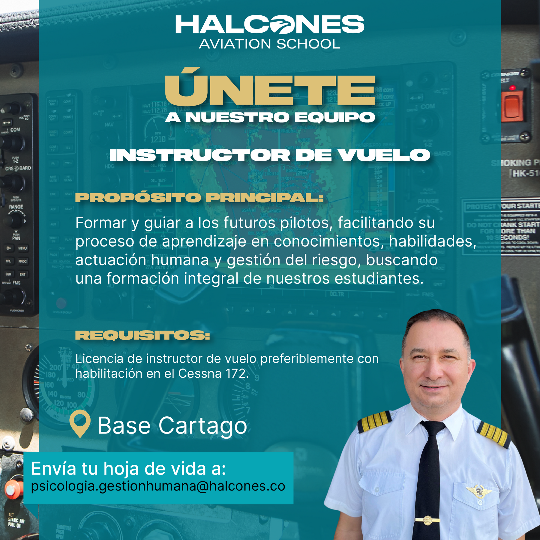 En Halcones Aviation School, nos enorgullece ser una institución líder en formación aeronáutica, comprometida con la excelencia y la innovación en cada uno de nuestros programas. Creemos firmemente que el éxito de nuestra escuela radica en el talento y la dedicación de nuestro equipo. Por eso, estamos constantemente en la búsqueda de profesionales apasionados y altamente capacitados que deseen formar parte de nuestro equipo y contribuir al desarrollo de la próxima generación de expertos en aviación.